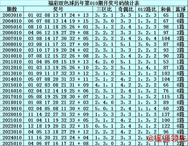 在第010期历史同期奖号中,红球三区分布总比例为57:49:32,奇偶总比例为75:63,012路比为38:46:54,和值分布在53-137之间,蓝球号码012路总比例为9:6:8。